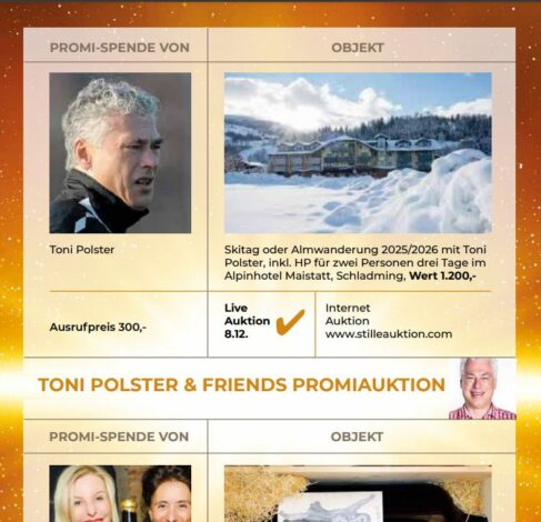 Toni Polster und viele prominente Freunde organisieren am 8. Dezember in Wiens einzigartigem Foodmarket und Eventlocation Gleis//Garten in Meidling zusammen mit Global Family und FC Global Kickers eine Promiauktion. Raritäten und Wertvolles: Viele Stars, Fußballlegenden, Topwinzer und Künstler sind dabei. Mit dem Erlös werden u.a. schwer betroffenen Familien vom Hochwasser kostenlose Urlaube beim „Reisebüro der Menschlichkeit“ ermöglicht.